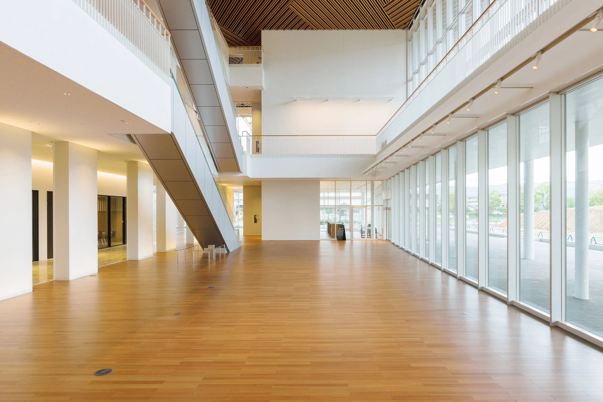 The central Hiroma atrium is a spacious, inviting area featuring warm wood finishes. From the adjoining Engawa and the third-floor observation terrace, visitors can view the Omidō Temple Ruins Historic Park, creating a landscape where architecture, nature, and history blend together.