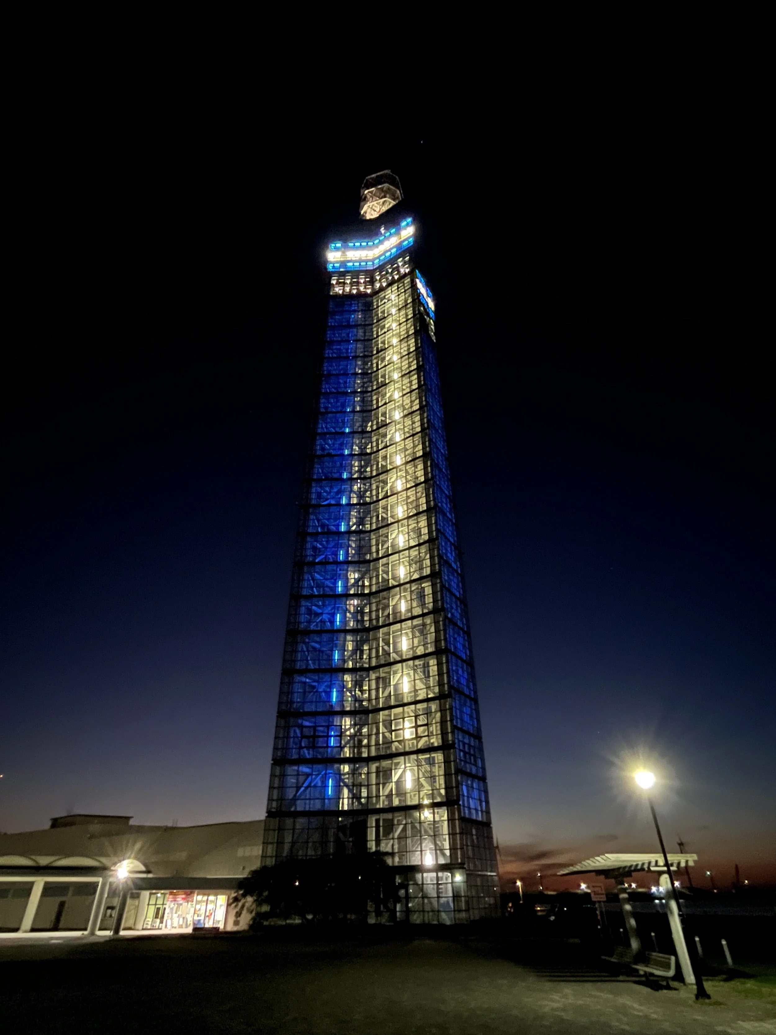 Each month, the tower is lit up in themed colors corresponding to seasonal events. Impressively, the colors are manually adjusted using film-wrapped fluorescent lights — a thoughtful touch by the staff.