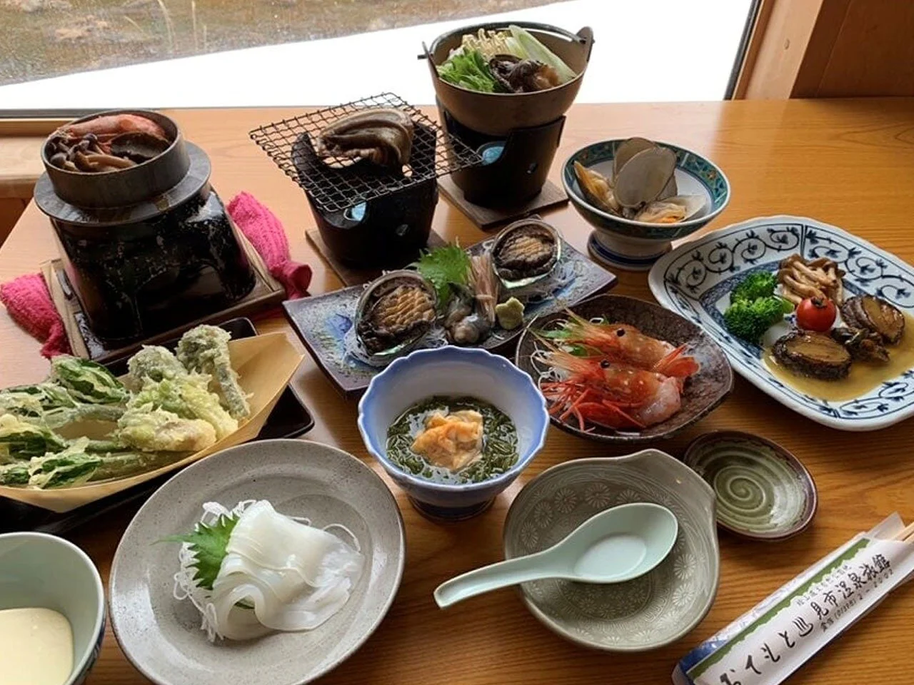 A hotpot dish with steamed uni, scallops from the nearby bay, deep-ocean tofu, and Kumaishi-grown egg. Served with abalone sashimi, grilled dishes, and seasonal vegetables.