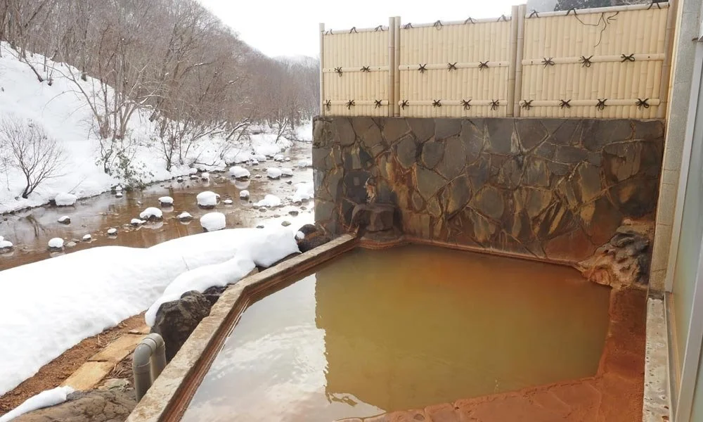The source of Kenichi Onsen flows from rocks 300 meters upstream at a temperature of 60–70°C, delivering 70 liters per minute.
