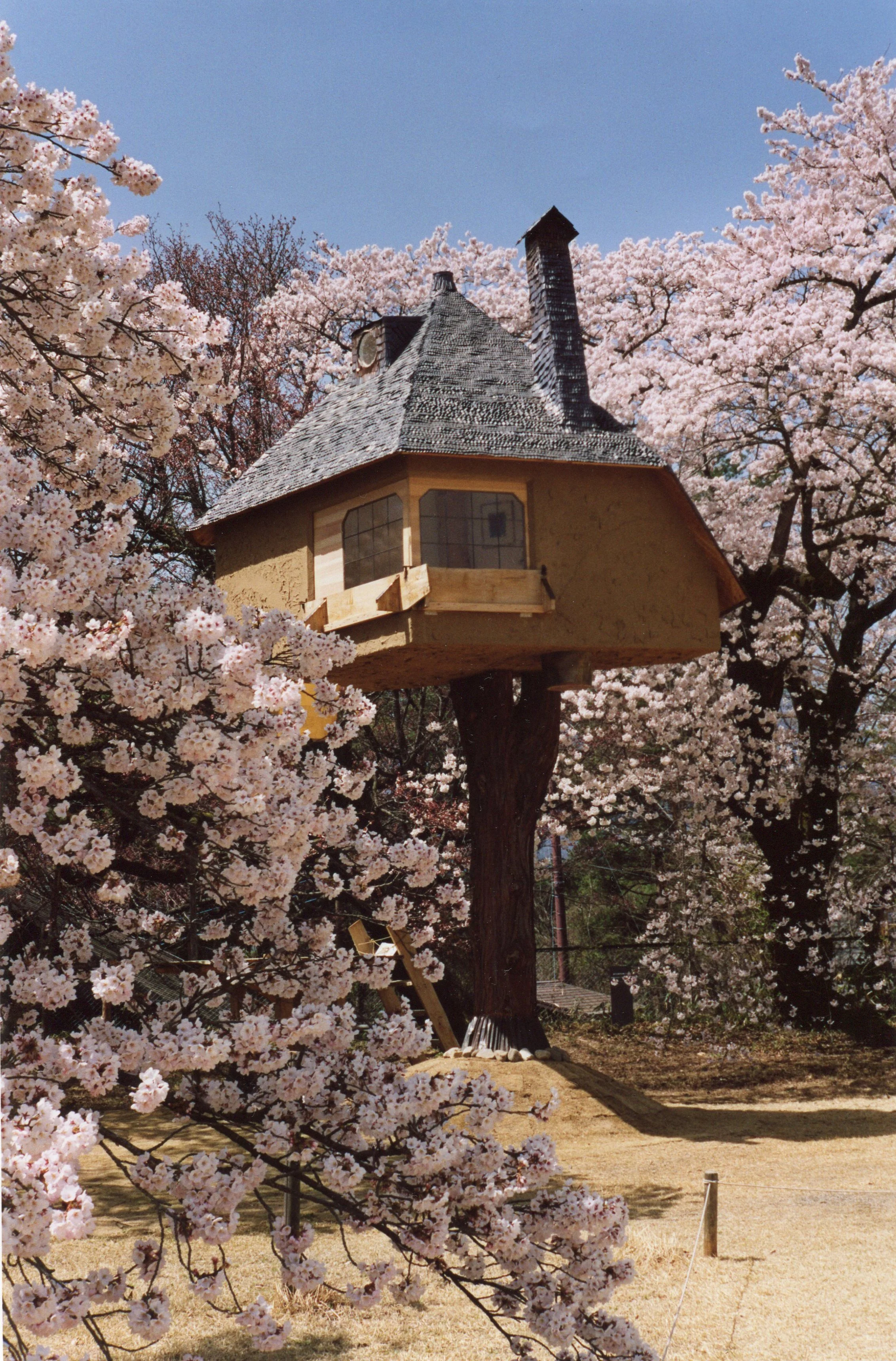 Architect Fujimori Terunobu’s Chashitsu Tetsu is supported by an 80-year-old cypress tree that once grew within the colony grounds. Its whimsical yet organic design contrasts with the serene interior, embodying both playfulness and the spirit of traditional tea culture. It is considered one of the most distinctive contemporary tea house designs in Japan.
