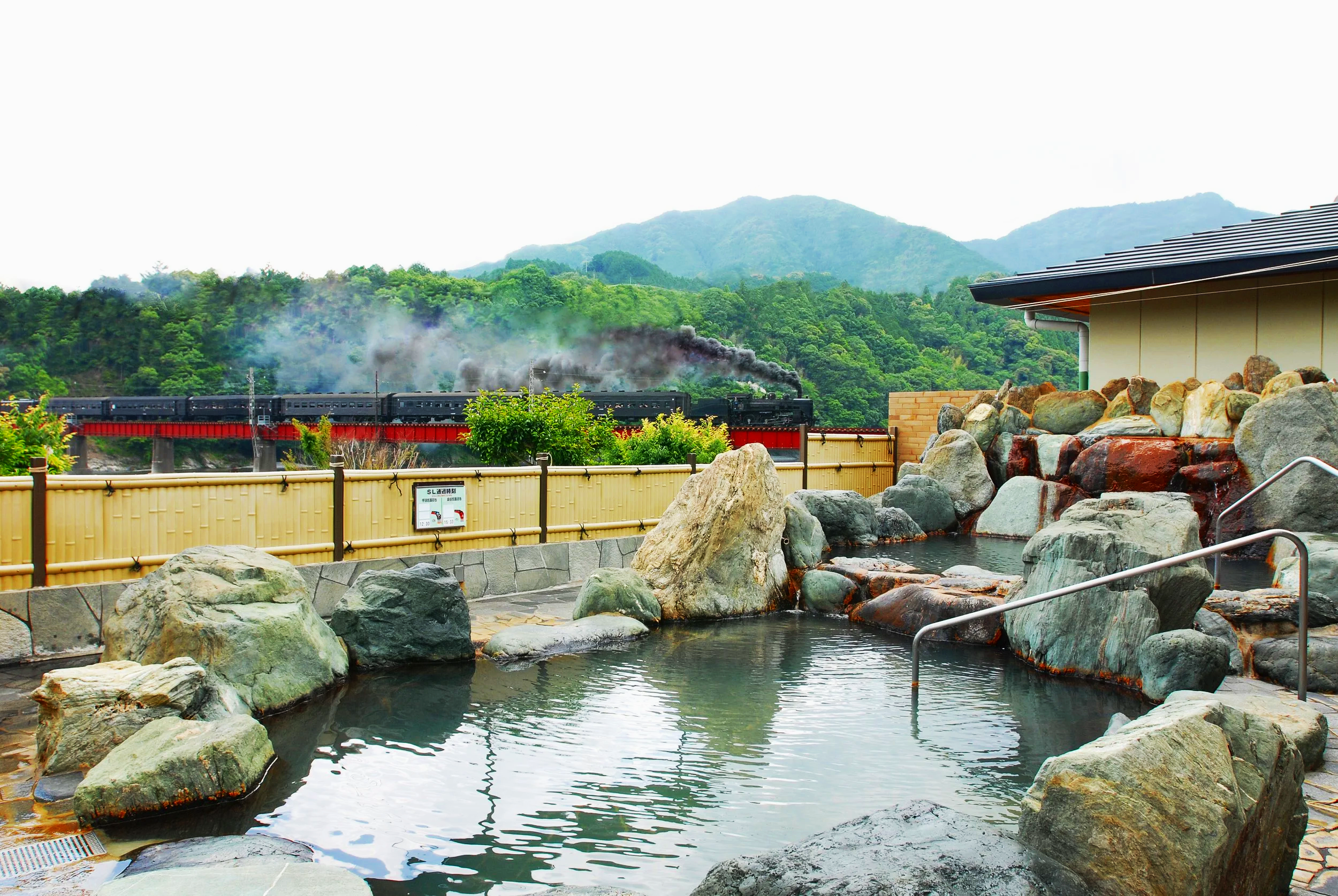 The Ōigawa Railway’s steam locomotives run on a fixed schedule. If you check the timetable in advance, you can enjoy the unforgettable sight of the train crossing the bright red bridge while relaxing in the bath. Perfect timing makes for a memory of a lifetime.