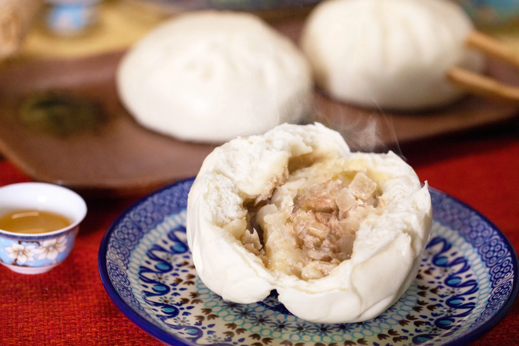 Steamed Chinese buns with meat filling on a decorative plate, accompanied by a small cup of tea and additional buns in the background.