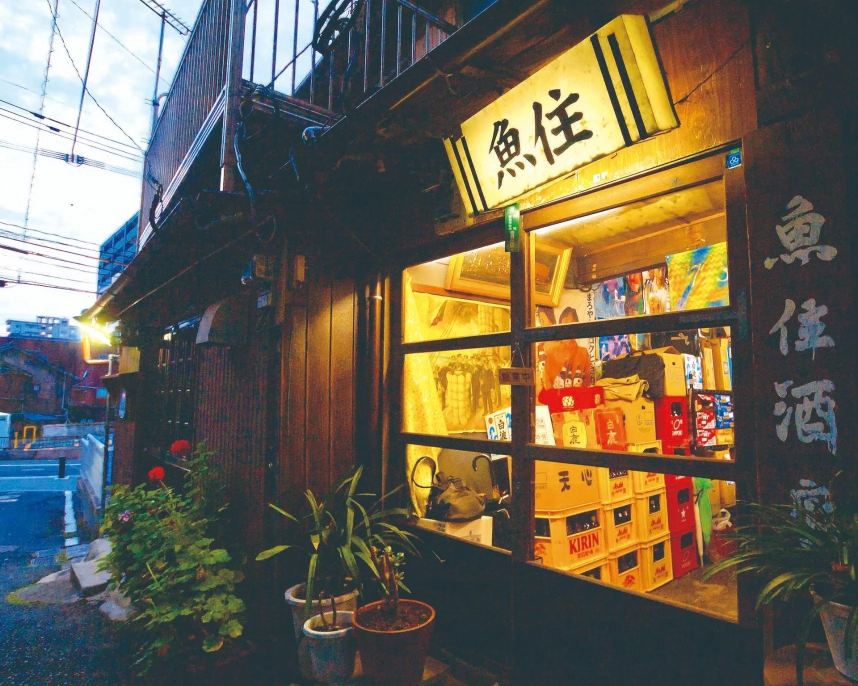 A Japanese storefront illuminated by warm yellow light displaying beverage cases and potted plants outside. The sign reads '魚住' (Uozumi) and there are stacked crates and bottles visible inside the shop.