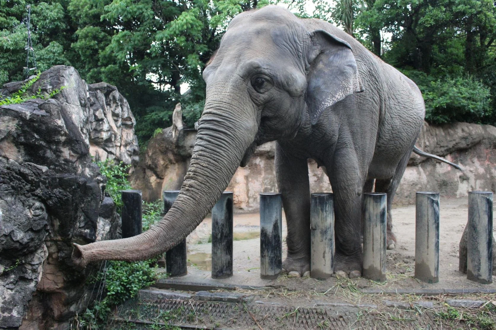 An elephant reaching its trunk towards a bush in a zoo enclosure with rocks, trees, and wooden posts.