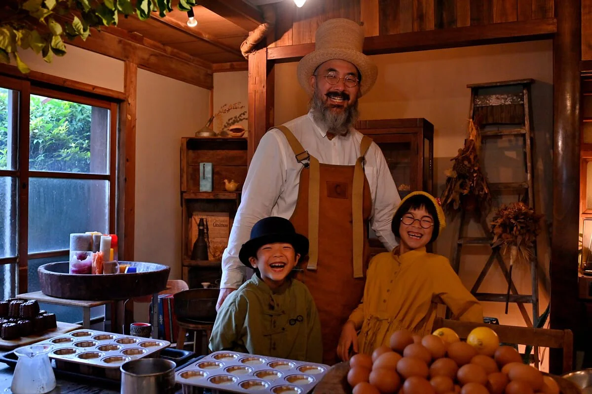 A man with glasses, a beard, and a tall hat, dressed in vintage clothing, standing with two children in a cozy, rustic kitchen, all smiling.
