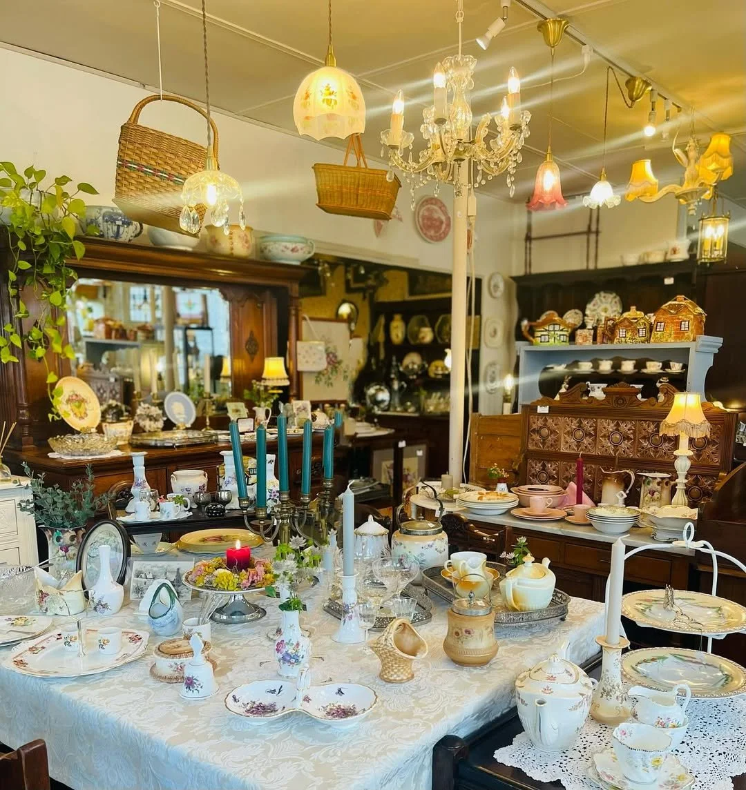 An antique store filled with vintage ceramics, china, and decorative items, including a dining table with tableware, candlesticks, and floral arrangements, with hanging lamps and chandeliers overhead.