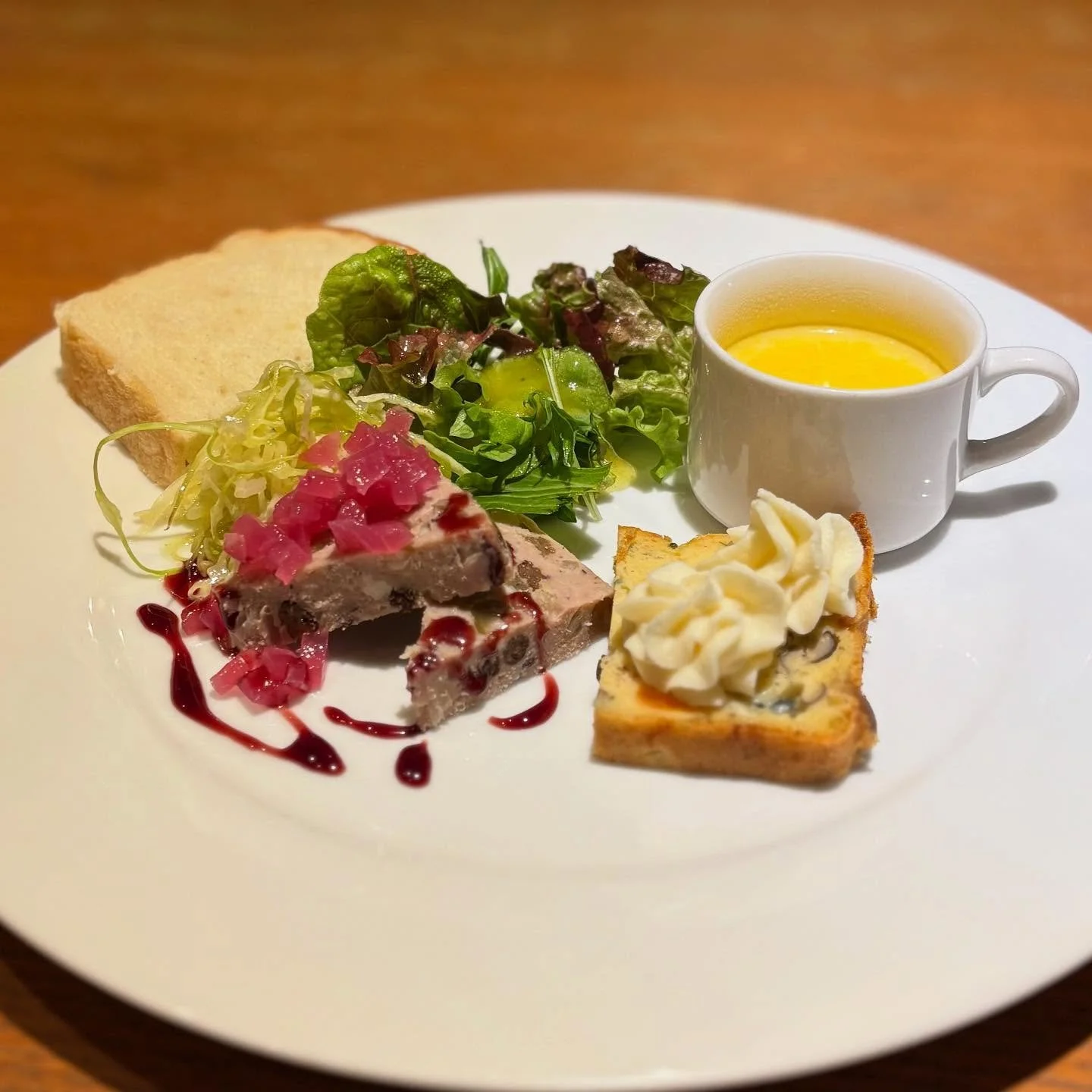 Plate with toast, salad, pâté with pink garnish, cup of yellow soup, and a slice of bread with whipped butter or cream