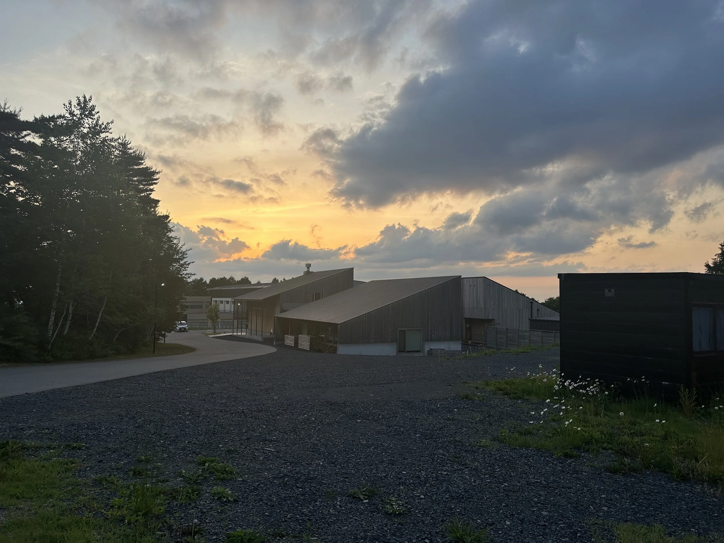 A sunset scene with a partly cloudy sky, trees on the left, and modern wooden buildings in the foreground and background.